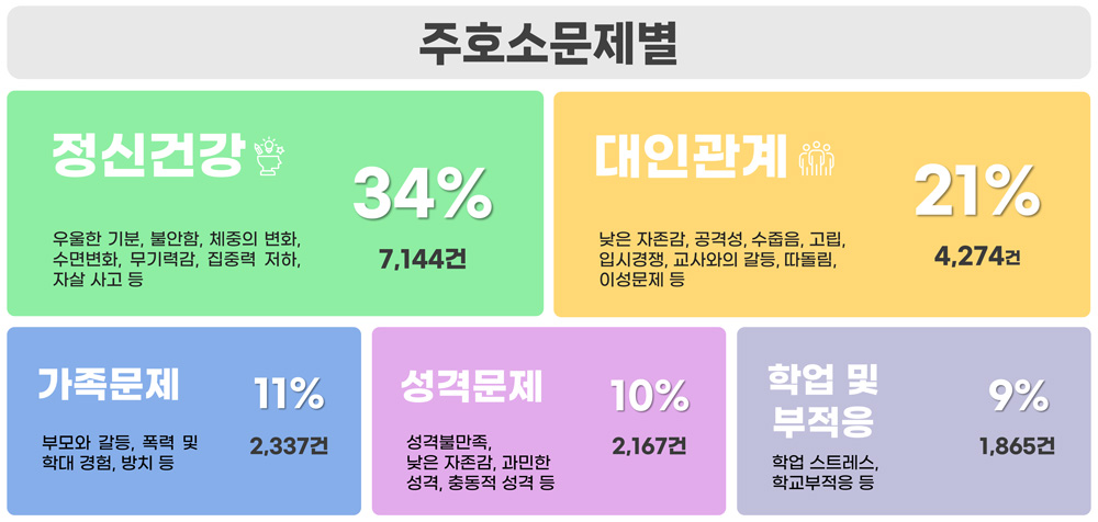 라임에 접수된 상담 내용을 살펴보면, 청소년들이 가장 많이 털어놓은 고민은 정신건강 문제(34%)였고, 이어 대인관계 문제(21%), 가족 문제(11%)순으로 나타났습니다.