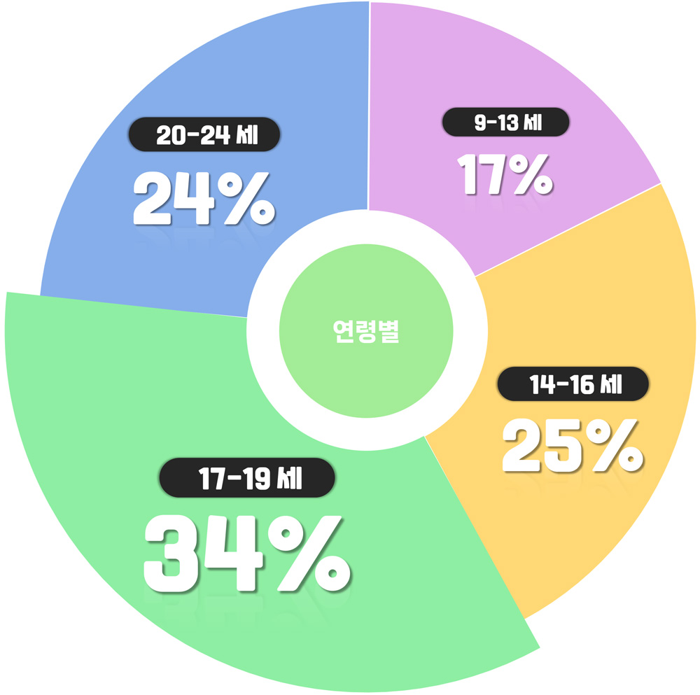 연령별로는 17~19세 청소년이 34%로 가장 높은 비중을 차지했으며, 학령 기준으로도 고등학생 이용 비율이 가장 두드러졌습니다.