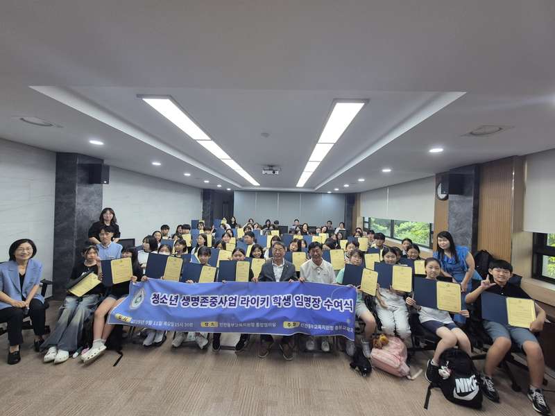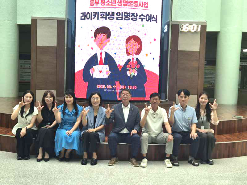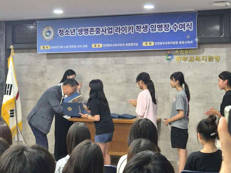 지난 9월 11일, 인천동부교육지원청은 ‘2025학년도 청소년 생명존중사업 라이키 학생 임명장 수여식’을 개최했습니다. 이번 수여식은 마음이 건강한 학교 문화 조성을 위한 라이키 프로젝트의 일환으로 진행되었으며,관내 초등학교 3교와 중학교 2교에서 선발된 청소년 리더 75명에게 임명장을 수여했습니다.